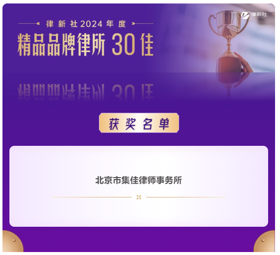 >kaiyun>关于我们>荣誉概览>2025>kaiyun入选律新社2024年度“精品品牌律所30佳” 集佳代理案例获评“律新社2024年度标杆案例”