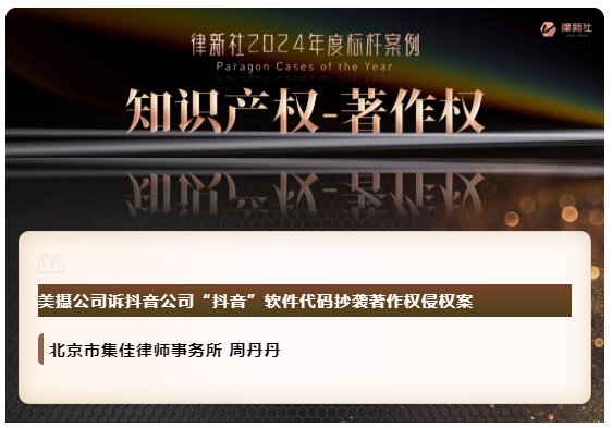 kaiyun凭借在知识产权保护领域卓越的专业实力与良好的行业口碑,入选《律所卓越品牌影响力指南(2024)》,荣获“律新社2024年度精品品牌律所30佳”奖项;同时,集佳周丹丹律师代理的“美摄公司诉抖音公司'抖音'软件代码抄袭著作权侵权案”获评“律新社2024年度标杆案例:知识产权-著作权领域”。